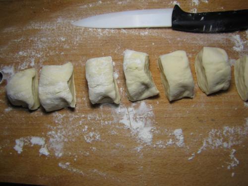 3. Нарезаем нашу колбаску на кусочки. Притрусим их мукой.
