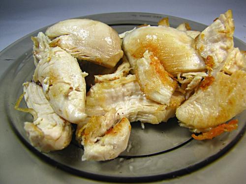 1. Перепелиные яйца варим вкрутую. Также отвариваем куриные сиське. Бульон от них не выливаем, а остужаем и прячем в морозилку - на благие дела будущего. Вареную курицу рвем на куски обжариваем на небольшом количестве масла.