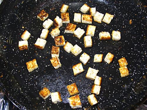 2. Для илитности приготовим кrутоны. Потому что "гренка не может стоить 8 долларов, а кrутон - может". Белый хлеб режем мелкими кубиками и обжариваем в той же сковороде, где только что была кура.