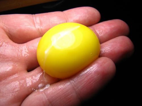 3. Приступим к салатной заправке. У куриного яйца отделим желток от белка. Кстати, это очень удобно делать не половинками скорлупы, а рукой - весь белок уйдет между пальцами.