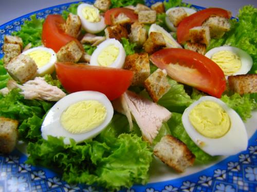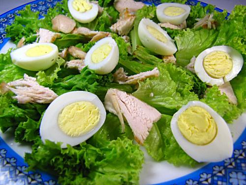 5. На тарелку выложим листья салата, сверху нарезанную курицу и половинки яиц.