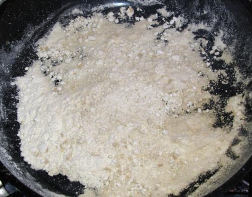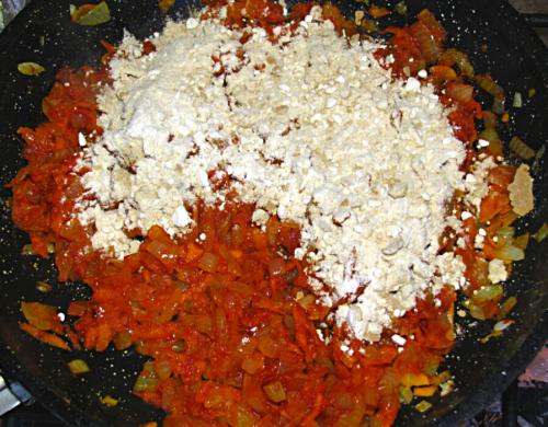 2. Лук мелко нарежем, морковь натрем на крупной терке, обжарим, добавим томатную пасту и муку. Дольем немного кипятка и оставим тушиться на маленьком огне минут 20.