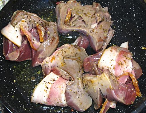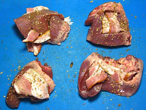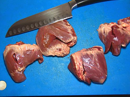 3. Тем временем займемся сердцами. Разрежем их пополам и срежем все жилки-жиринки. Сделаем прорезы чтобы было куда пихать грудинку. Мне, кстати, сердца уже достались изрядно растерзанные мясником :)