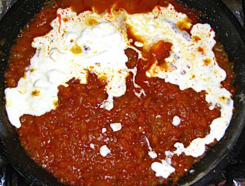 5. Уже, кстати, прошли 20 минут, добавляем в овощи сметану и паприку, солим, тушим еще минут пять и перекладываем в форму для запекания.