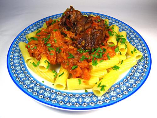 8. Гарнир сюда подходит просто совсем любой, мне захотелось с макарошками. Сердце с овощным соусом получилось очень нежное.