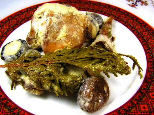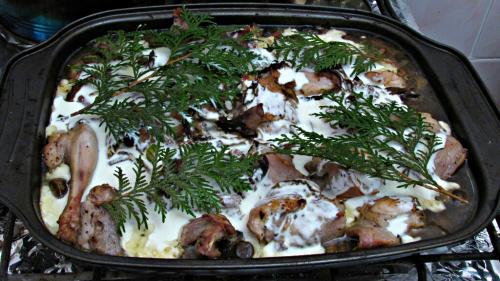 Муку разводим в воде и смешиваем со сметаной. Заливаем кролика, сверху кладем веточки туи и продолжаем тушить 30-40 минут при температуре около 140 градусов.