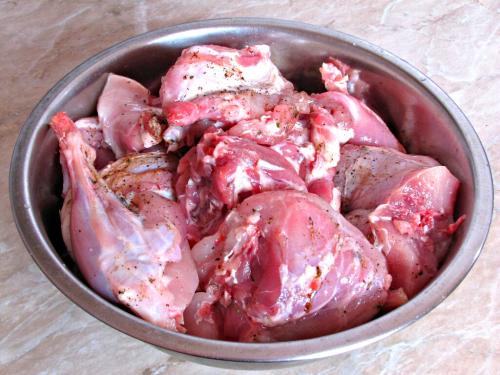 Вооружаемся острым рубящим предметом, потрошим и рубим кроля, солим, перчим и обтираем специями. Ставим в холодильник на 6-8 часов.