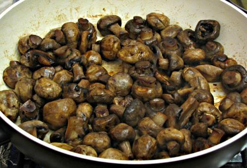 Шампиньоны обжариваем, сначала из них выйдет вода, потом появится корочка.