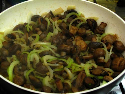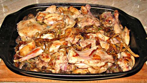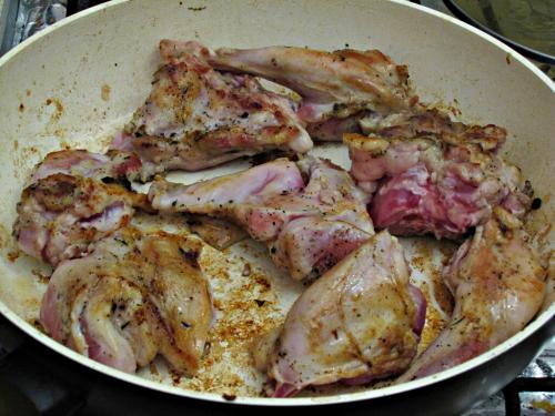 В утятнице обжариваем кролика до корочки, туда же складываем шампиньоны с луком и нарезанные полосками белые грибы. У меня же утятницы ни фига нет, поэтому обжаривал в сковородке,