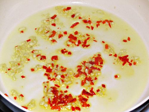 Перец очищаем от семечек, чеснок давим ножом. Мелко режем и тот, и другой. Обжариваем на небольшом огне, постоянно помешивая, так, чтобы они отдали свой аромат маслу и не пригорели.
