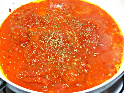 Добавляем помидоры без шкурок, раздавливаем, солим, перчим, посыпаем орегано и тушим на небольшом огне минут 15-20.