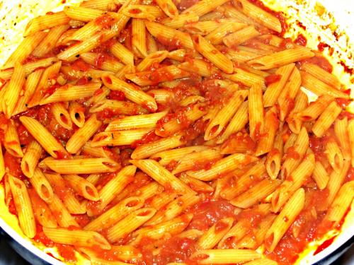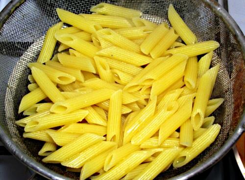 Параллельно варим перья до аль-денте. Откидываем на дуршлаг, не промываем. Немного воды от макарон можно оставить на случай, если соус вышел слишком густой.