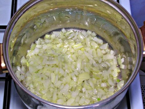 Возьмем кастрюлю и обжарим в ней луковицу до мягкости и побеления.