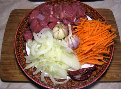 Мясо нарежем небольшими кусочками, как на гуляш, лук - тонкими кольцами. Морковь нарежем тонкой соломкой, но ни в коем случае не на терке. Надо, чтобы она (морковка) сохраняла свою форму. Натертая морковь превратится в кашу. Чеснок очистим от верхней шкурки - так, чтобы были видны зубцы.