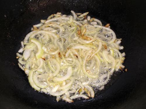 Выкладываем лук. Слегка солим и, постоянно помешивая, доводим до золотистости на большом огне.
