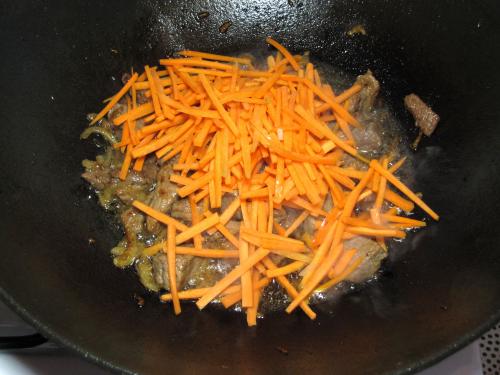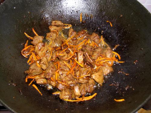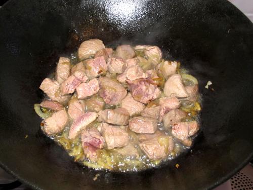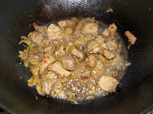 Теперь очередь мяса. Выкладываем его понемногу, чтобы не охладить масло. Добавляем примерно пол-чайной ложки зиры, растерев ее в руках. Иногда помешивая, жарим минут 7, пока мясо не покроется золотистой коркой.