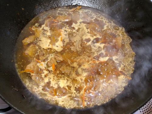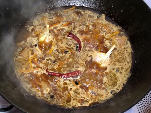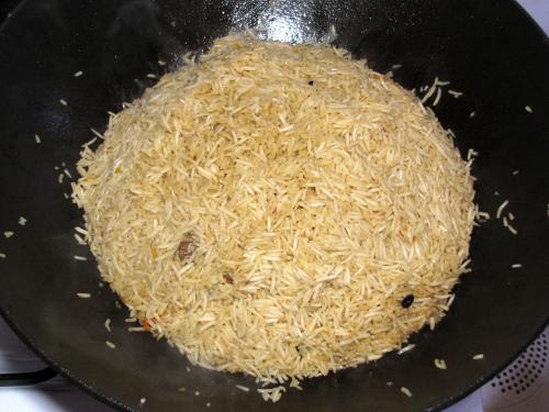 Еще одно заблуждение - что плов надо готовить исключительно в казане. Конечно же нет, пойдет любая толстостенная посуда с (желательно) сферическим дном. Я, например, казаном не разжился, поэтому готовлю плов в воке. Разница в основном та, что вок более пологий, приходится тщательнее контролировать уровень воды.