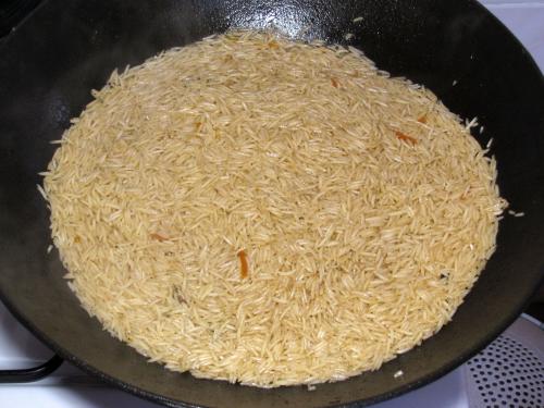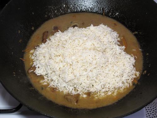 Воды лучше недолить, чем перелить - после закладки риса всегда будет возможность ее долить. И вот тот самый нюанс, о котором я писал вначале. Из-за того, что стенки вока более пологие, чем у казана, воды понадобилось больше.