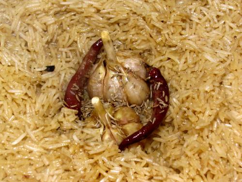 Берем из середины рис на пробу. Он должен быть “аль-денте” - упругий внутри, но не сухой. Когда это случится, выкопаем в центре ямку, положим туда чеснок, перец и еще с пол-чайной ложки зиры.