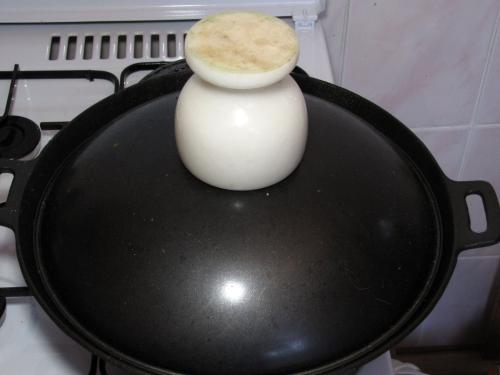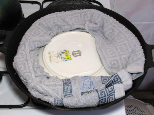 Накроем казан блюдом, подходящим по размеру и укутаем по краям чистым полотенцем. Сверху накроем крышкой. Я для надежности еще придавил мраморной ступкой.