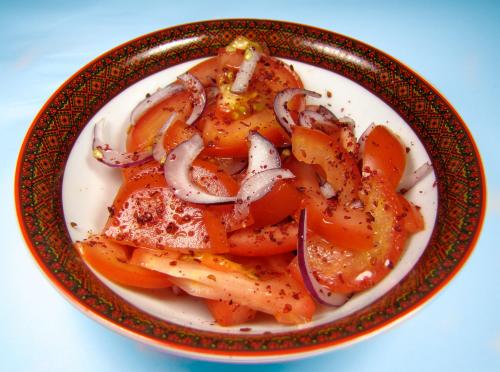 А мы, тем временем, приготовим простой традиционный салат к плову. Тонко нарежем помидоры с луком. Лук хорошо промоем водой, смешаем, заправим солью и красным перцем, посыпем сумахом.