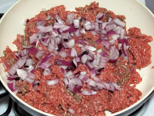 Возьмем сотейник или сковорду с высокими краями, положим в нее фарш и мелко нарезанный лук.