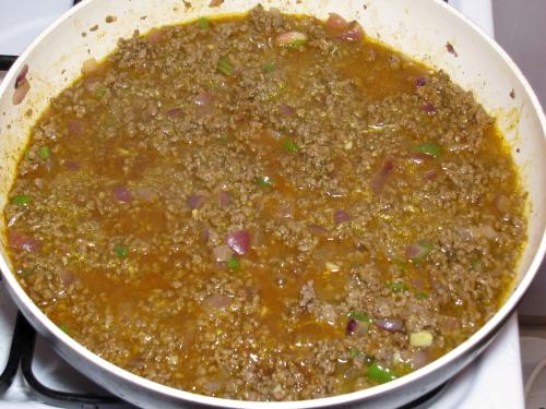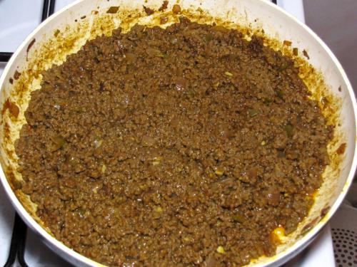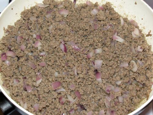 После чего ставим сковороду на средний огонь. Отметим два важных момента - посуда изначально должна быть холодной и мы не добавляем масло. Благодаря этому мясо будет не жариться, а тушиться в собственном соку. Постоянно помешиваем фарш лопаткой, разбивая крупные комки. Минут через 7-10 у нас получится однородная крошка серо-коричневого цвета.