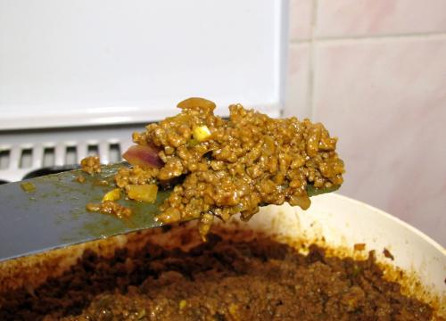 Как определить, что фарш готов? Наберите его лопаткой и немного пошатайте ею в стороны. Фарш должен на ней держаться, не разваливаться, но и не стекать.