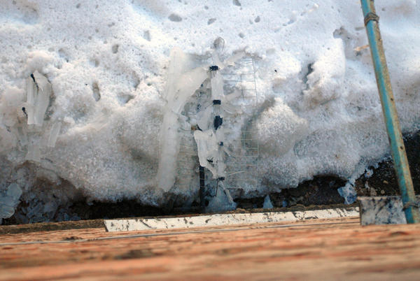 Цікаво те, що раптово з даху (і це вже не вперше) з одного і того ж самого місця ллється вода, яка покриває льодом всі антени та стіни, і так протягом хвилин 10ти...
