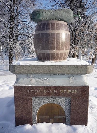 Нежинские огурцы, прославившие город, обрели популярность во времена правления императрицы Екатерины II, которая приказала обеспечивать ими императорский двор, что выполнялось до 1917 г. В советские времена продукция Нежинского консервного завода также пользовалась неизменной популярностью благодаря особому хрусту и характерному вкусу местных огурцов, что объясняется свойствами почвы. Сейчас нежинские соленья экспортируют в 70 стран мира. В 2005 г. перед центральным входом завода установлен памятник нежинскому огурцу. Он изображён лежащим на бочке для засола, которая стоит на погребке для хранения консервации.