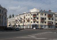 На спуске по левой стороне мы увидим СИЗО, огражденное толстенной каменной стеной, где сидят до суда всякие нехорошие люди, говорят, если постоять там достаточно долго можно увидеть как заключенные "пускают коней" - нормальным языком передают друг другу записки. Справа будет здание дома культуры строителей - раньше там можно было по самой недорогой цене в городе поиграть в настольный теннис и бильярд, было уютное кафе - сейчас здание выставлено на продажу.