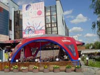 Рассмотрим подробнее все, что здесь имеется. Сперва кафе "Этуаль" - вход со стороны магазина "Пятницкий", продуктовый отдел которого работает круглосуточно (запомните, это может пригодится). Кафе разделено на три зала - в первом непосредственно само кафе, во втором биллиардные столы, в третьем дискотека "Кураж" (вход по будням 30 гр., по выходным и праздникам от 30 до 80 грн. ) - в принципе дискотека неплохая, но зал маловат, особо не развернешься. К "Этуалю" еще пристроена летняя площадка, а напротив есть скверик с лавочками и миниатюрными копиями Эйфелевой башни, пушки №13 (такая же как на Валу) и египетской пирамиды. Симпатичный интерьер, богатое меню, подают бизнес-ланчи и завтраки, но цены одни из самых дорогих в городе, особенно на спиртное.