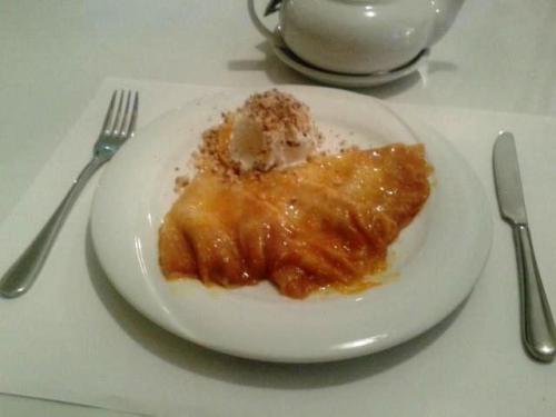 десерт "Апельсиновые блинчики" с мороженным посыпанным тёртыми орехами и собственно с самим апельсином - 39 грн