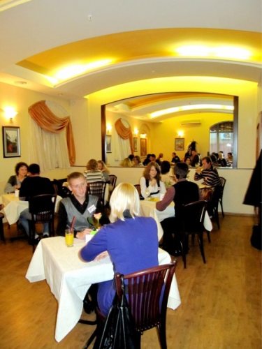 Европейская кухня, всегда свежая выпечка, кофейная и чайная карты, среди десертов можно найти "суп из шампанского".