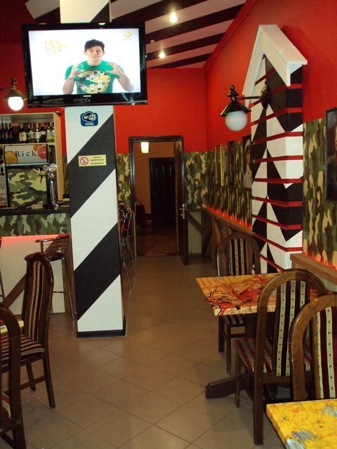 Заведение стилизировано под военную тематику. Здесь Вы можете посидеть с друзьями, посмотреть футбол или устроить банкет. В заведении 2 зала: основной на 40 человек и банкетный на 20 персон.