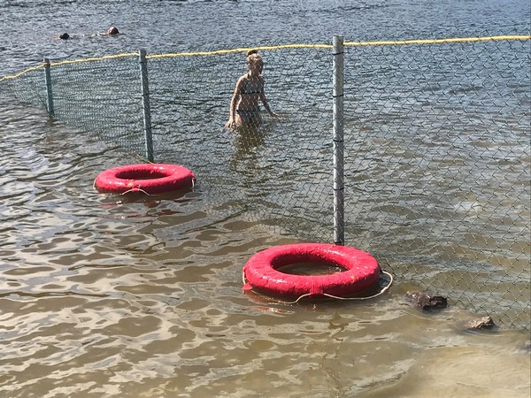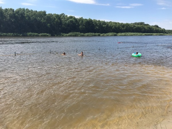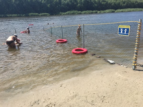 Уделили внимание и безопасности при купании. На территории огражденного детского пляжа есть несколько спасательных кругов. Как видно на фото, некоторые родители используют их для обучения детей плаванию.