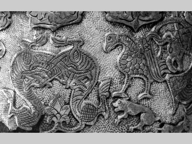 На чудесном широком фризе этого произведения искусства изображены причудливо изогнутые и переплетенные между собой фигуры птиц, зверей и фантастических животных. Некоторые из них кусают друг друга, иные стоят отдельно.
