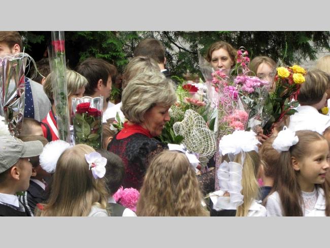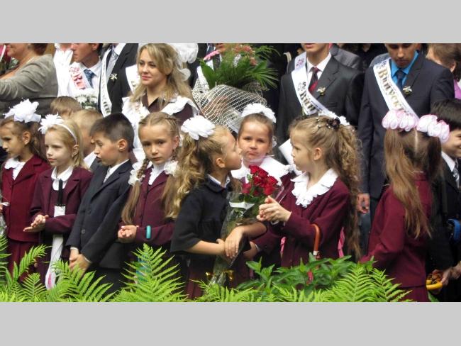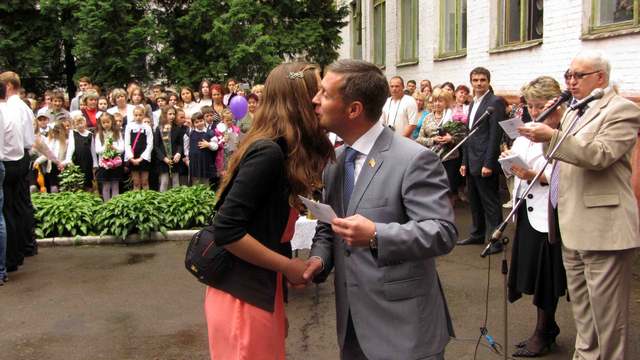 Единственное, чего мы не увидели в школе, так это грамот для особо отличившихся (может быть, потому, что несколько опоздали к началу линейки, а может и потому, что их просто не было). Всем, кто показал хорошие результаты в учебе, спорте и культурно-массовой работе были вручен денежные премии от депутата городского совета Артема Стаха. Как сказали учителя, такие премии от депутата горсовета уже на протяжении довольно длительного периода времени ежегодно получают лучшие ученики школы. А 1-го сентября лучшему из лучших учеников вручают специальный приз – ноутбук. Премий от Артема Стаха было довольно много – около 70-ти. Мы обратили внимание на то, что ученики выходили за ними гораздо охотнее, чем за грамотами в других школах. Как нам сказали учителя, премия – 30 грн. А учитывая то, что каждый из учеников мог получить несколько премий (по одной в каждой номинации) то это – реальный стимул стать лучшим. Вручая премии, Артем Стах охотно целовал в щечку симпатичных молодых выпускниц.