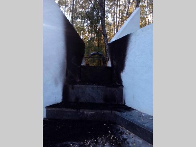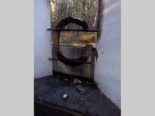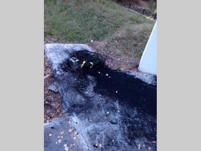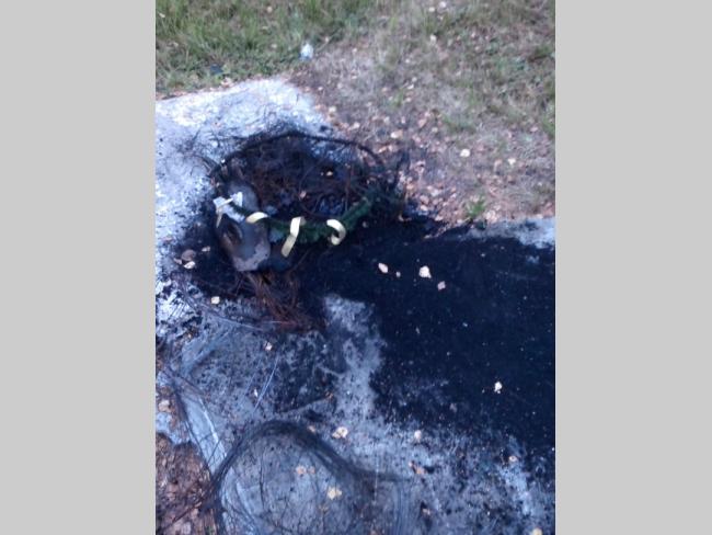 В результате поджега были сожжены мемориальные венки, а также сам заметны следы на самом памятнике.