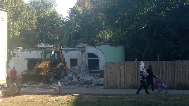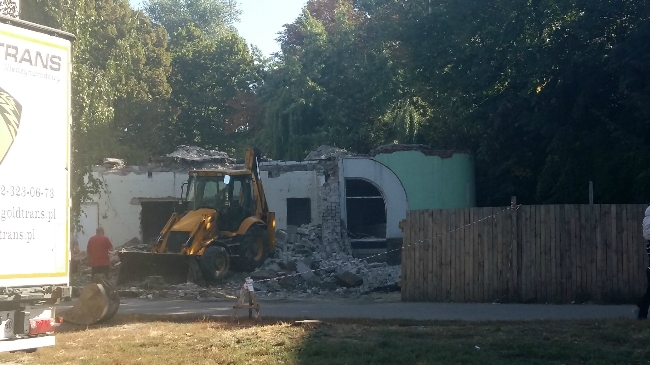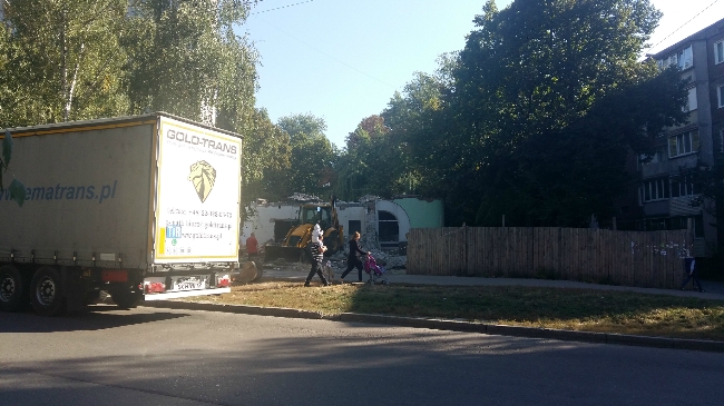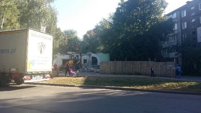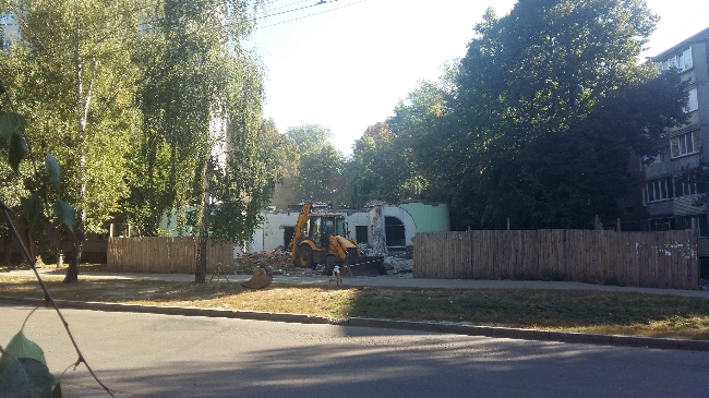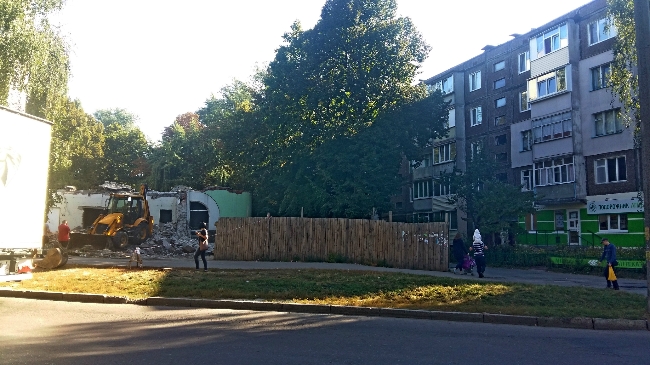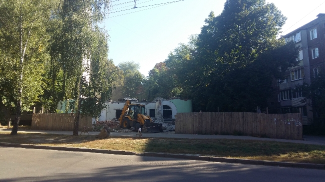 Долгое время здание аптеки было ограждено строительным забором. Сегодня 19 сентября на территорию приехал экскаватор, прибыли рабочие и начали сносить постройку.
