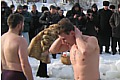 Едва ли не в клубок свернувшийся от холода голубь сидит перед передней стеной Екатерининской церкви и даже не реагирует на рядом проходящих людей. Его взгляд устремлен в правую, киевскую сторону, где несколько десятков горожан окружили стол с бочкой воды на нем. Вода святая, а потому пользующаяся повышенным спросом у населения.