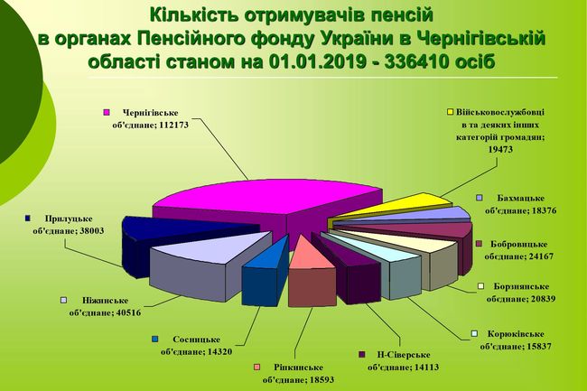 - Станом на 1.01.2019 року в Чернігівській області налічується 1461 пенсіонерів, які отримують пенсійне забезпечення понад 10 тисяч грн. Це судді (111чол.), народні депутати (3 чол.), прокурори (129 чол.), льотчики цивільної авіації (112 чол.) та деякі інші категорії громадян.