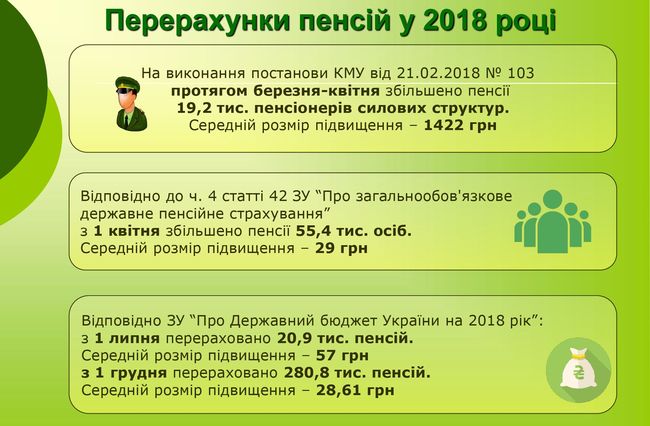 Влітку надбавка складе 67 гривень, а в грудні - 74 гривні. Найбільш відчутним стане весняне підвищення - пенсії зростуть в середньому до 20%. В березні індексація фактично примножить пенсійні виплати тих, у кого було оновлення пенсії, на коефіцієнт. Він наполовину складається з росту фонду заробітної плати та наполовину - з інфляції. У липні пенсії перерахують знову відповідно до нового прожиткового мінімуму.