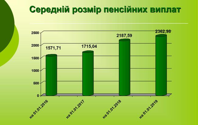 - Середній розмір пенсії в області станом 01.01.2019 склав 2363 грн., що на 175 грн. більше ніж на початок минулого року та на 58% перевищує прожитковий мінімум для осіб, які втратили працездатність (1497 грн.). Найбільш поширена категорія пенсіонерів в області це ті, які отримують пенсію за віком (близько 74 %).
