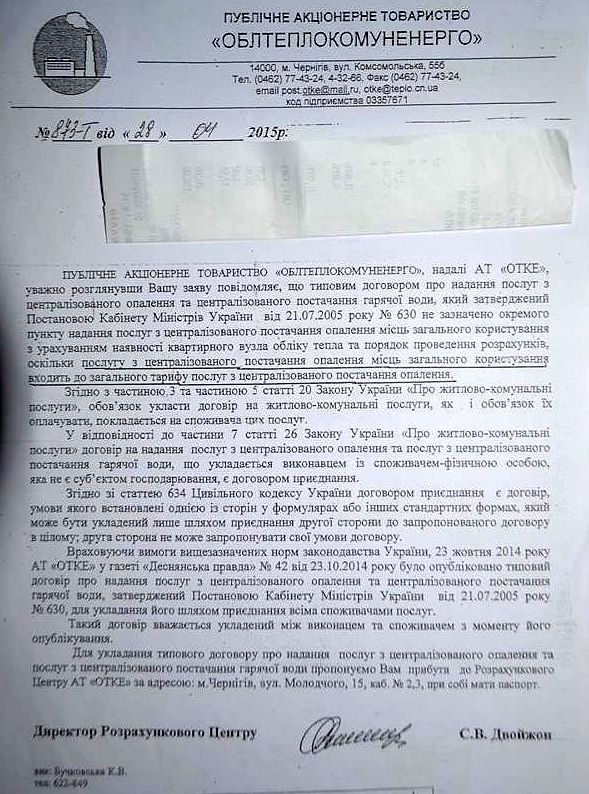 - Між мною, мешканцем багатоповерхового будинку (просп. Перемоги, 155) та ПАТ «Облтеплокомуненерго» 23.01.2006 було укладено договір про надання послуг з централізованого опалення та водонагрівання. Згідно з договором «Облтеплокомуненерго» надає ці послуги у квартирі, де я проживаю, а я зобов'язуюсь своєчасно оплачувати надані послуги за встановленими тарифами щомісяця не пізніше 20 числа місяця, наступного за розрахунковим.