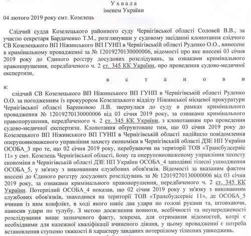 В ухвалі слідчого судді Козелецького районного суду Соловей В.В. стосовно задоволення клопотання слідства щодо проведення судово-медичної експертизи для встановлення ступеню тяжкості, характеру та механізму заподіяння тілесних ушкоджень, зазначено: «… наніс два удари по голові руками та, штовхаючи, наносив удари по тулубу». Як відомо з достовірних джерел, оперативник тижнів зо три лікувався в стаціонарі.