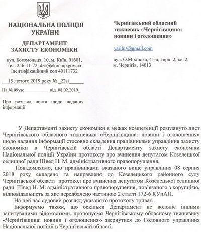 Через відсутність правдивої інформації про резонансну подію, до якої причетні публічні особи (керівник району і його дружина), по Козельцю й далі гуляють чутки, обростають новими історіями. Щоб підтвердити їх або спростувати, редакція «Чернігівщини» звернулася листом до Департаменту захисту економіки Національної поліції України за роз’ясненням. І по одній інформації одержали офіційне підтвердження: «…працівниками управління захисту економіки в Чернігівській області Департаменту захисту економіки Національної поліції України складено протокол про вчинення депутатом Козелецької селищної ради Швед Н.М. адміністративного правопорушення , пов’язаного з корупцією, відповідальність за яке передбачено частиною 2 статті 172-6 КУпАП». Протокол переданий 8 серпня 2018 року на розгляд до Козелецького районного суду. Судовий розгляд досі триває.