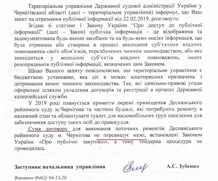 22 лютого сайт Gorod.cn.ua звернувся з інформаційним запитом до начальника управління Державної судової адміністрації України у Чернігівській області Целуйко Михайла Федоровича. Ми хотіли дізнатися, який обсяг коштів спрямовано на ремонт у Деснянському районному суді. В самому суді нам повідомили, що так як приміщення їм не належить, всіма питаннями з приводу ремонту керує Державна судова адміністрація.