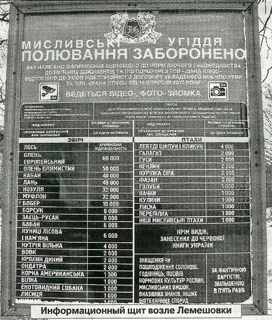По поводу информационного щита объясняет: раньше не давал команды убрать, так как на нём, кроме указанной информации, были обнародованы утверждённые Министерством аграрной политики и продовольствия и Министерством экологии и природных ресурсов таксы для расчета размера возмещения ущерба, нанесённого вследствие нарушения законодательства относительно охотничьего хозяйства и охоты.
