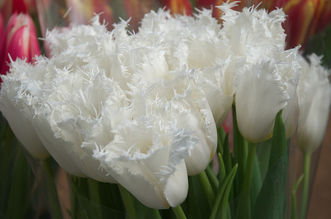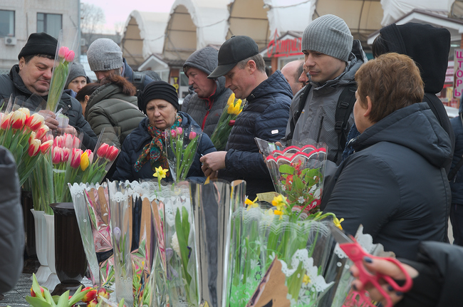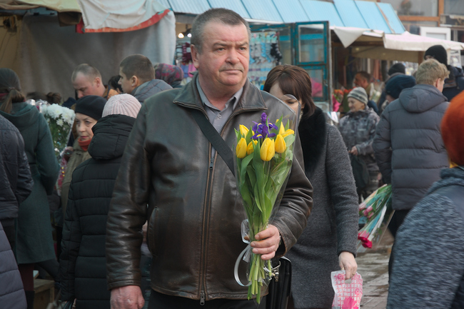 Дедушка продает тюльпаны возле «Мегацентра» у подземного перехода по 15 гривен за штуку. Продает дешево, старается все продать пока не прогнали. Чем ближе к рынку, тем выше цены. На подходе к нему, один тюльпан уже 25 гривен. В цветочных киосках возле рынка, тюльпаны по 30 гривен за штуку, розы – 60 гривен. Хризантемы – 43 гривен за ветку из пяти штук. Ветка мимозы здесь – 150 гривен.